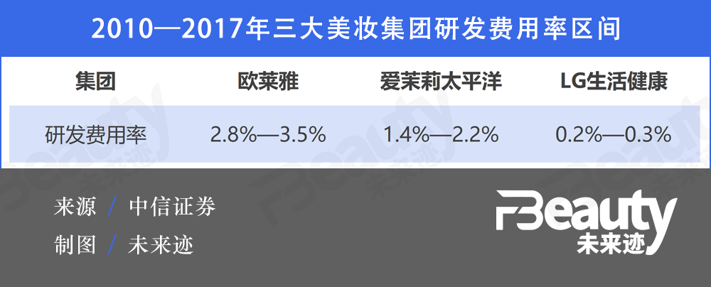 這其中,研發(fā)實力是高端消費市場的一個重要壁壘,長期以來,歐萊雅等巨頭對于研發(fā)的大量投入,讓他們擁有了雄厚的技術(shù)資本,根據(jù)中信證券數(shù)據(jù),2010-2017年期間,歐萊雅集團的研發(fā)費用率達2.8%-3.5%,遠高于愛茉莉太平洋和LG生活健康。