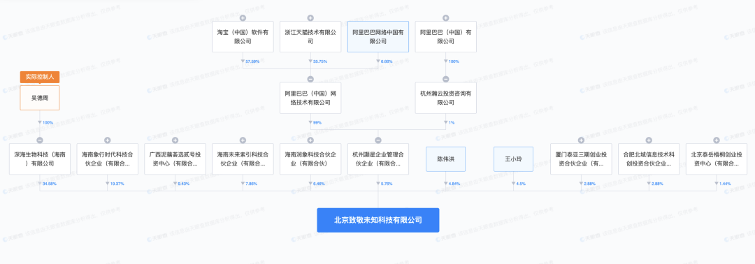 目前,吳德周通過深海生物科技(海南)有限公司持有致敬未知34.58%股份,為公司第一大股東;阿里通過杭州灝星企業(yè)管理合伙企業(yè)(有限合伙)間接持股5.76%。
