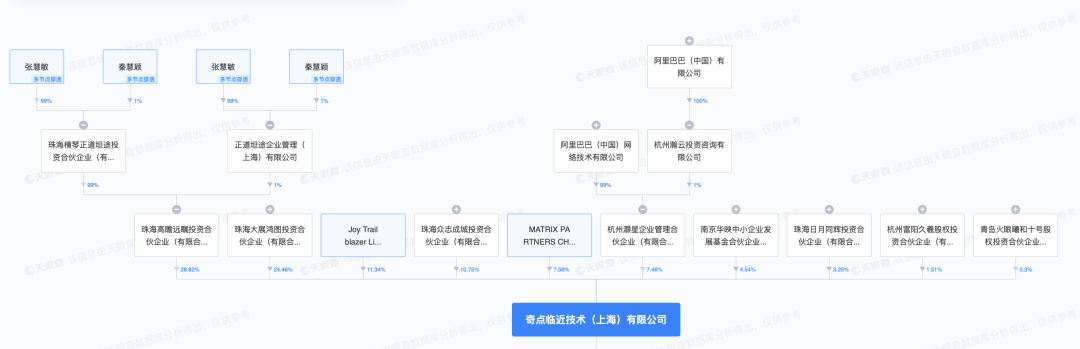 天眼查App信息顯示,7月24日,奇點臨近發(fā)生工商變更,股東新增阿里旗下杭州灝星企業(yè)管理合伙企業(yè)(有限合伙),持股比例為7.46%。
