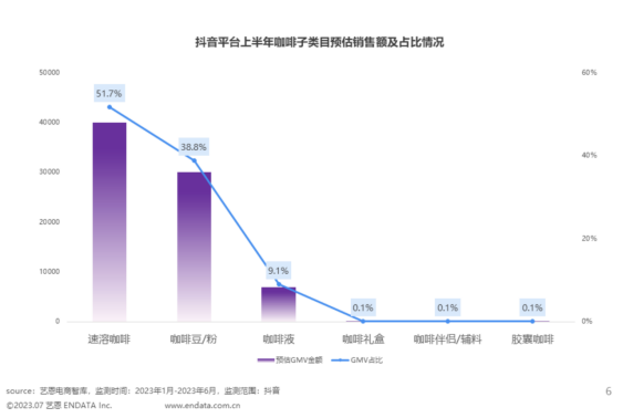 而在抖音卻呈現(xiàn)出另一種樣貌。精品咖啡不靈了,這里是高性價(jià)比速溶咖啡的天下,根據(jù)藝恩發(fā)布的《2023H1咖啡用戶消費(fèi)趨勢洞察》,抖音平臺咖啡子類預(yù)估銷售額及占比中,速溶咖啡占到了總體咖啡GMV的51.7%。