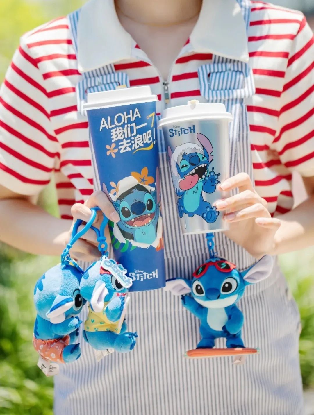 第一波聯(lián)名新品,是史迪奇系列的夏日新品,包含了桃李淘七、蜜桃火龍果奶昔等產(chǎn)品,聯(lián)名周邊有貼紙、玻璃杯、杯塞、便當包等。