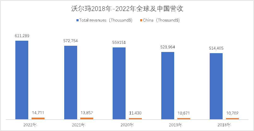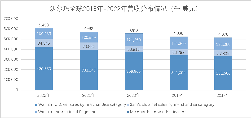 筆者梳理沃爾瑪近五年(2018年-2022年)的全球年報(bào)數(shù)據(jù)發(fā)現(xiàn),其全球營收由5144億美元增長至6113億美元,復(fù)合增長率為4.41%,且始終在全球零售企業(yè)中排名第一。