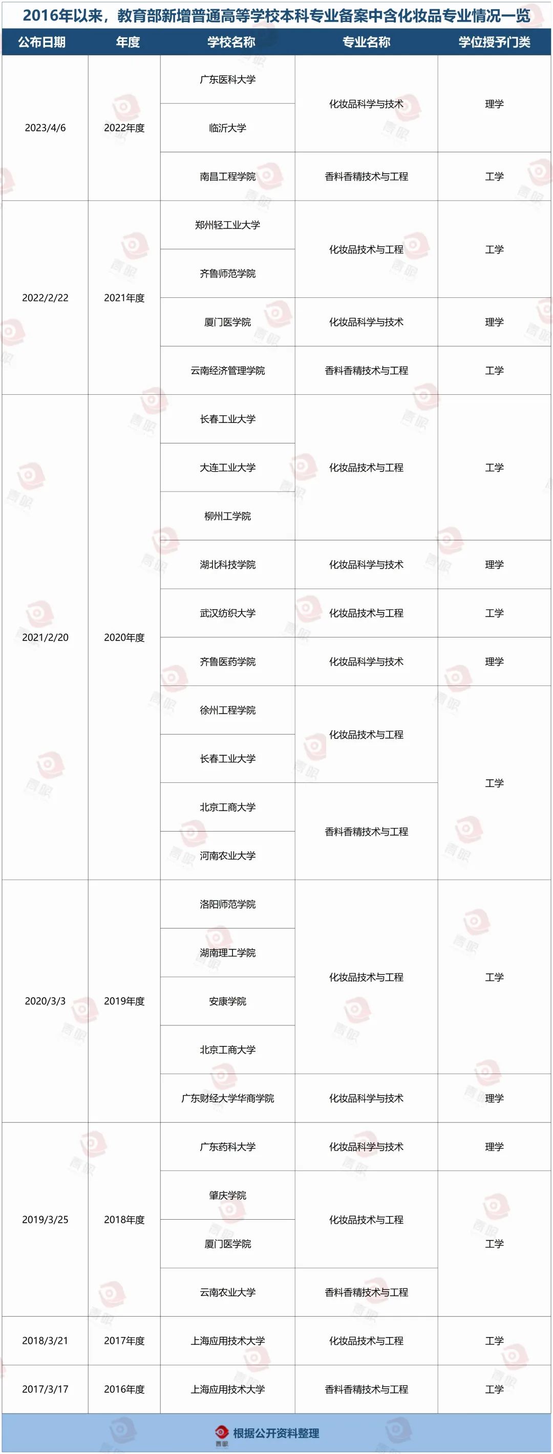 青眼不完全梳理了自2016年以來,教育部新增普通高等學(xué)校本科專業(yè)備案中含化妝品專業(yè)情況,相繼有24所高校在近7年內(nèi)獲批開設(shè)了化妝品相關(guān)專業(yè)。