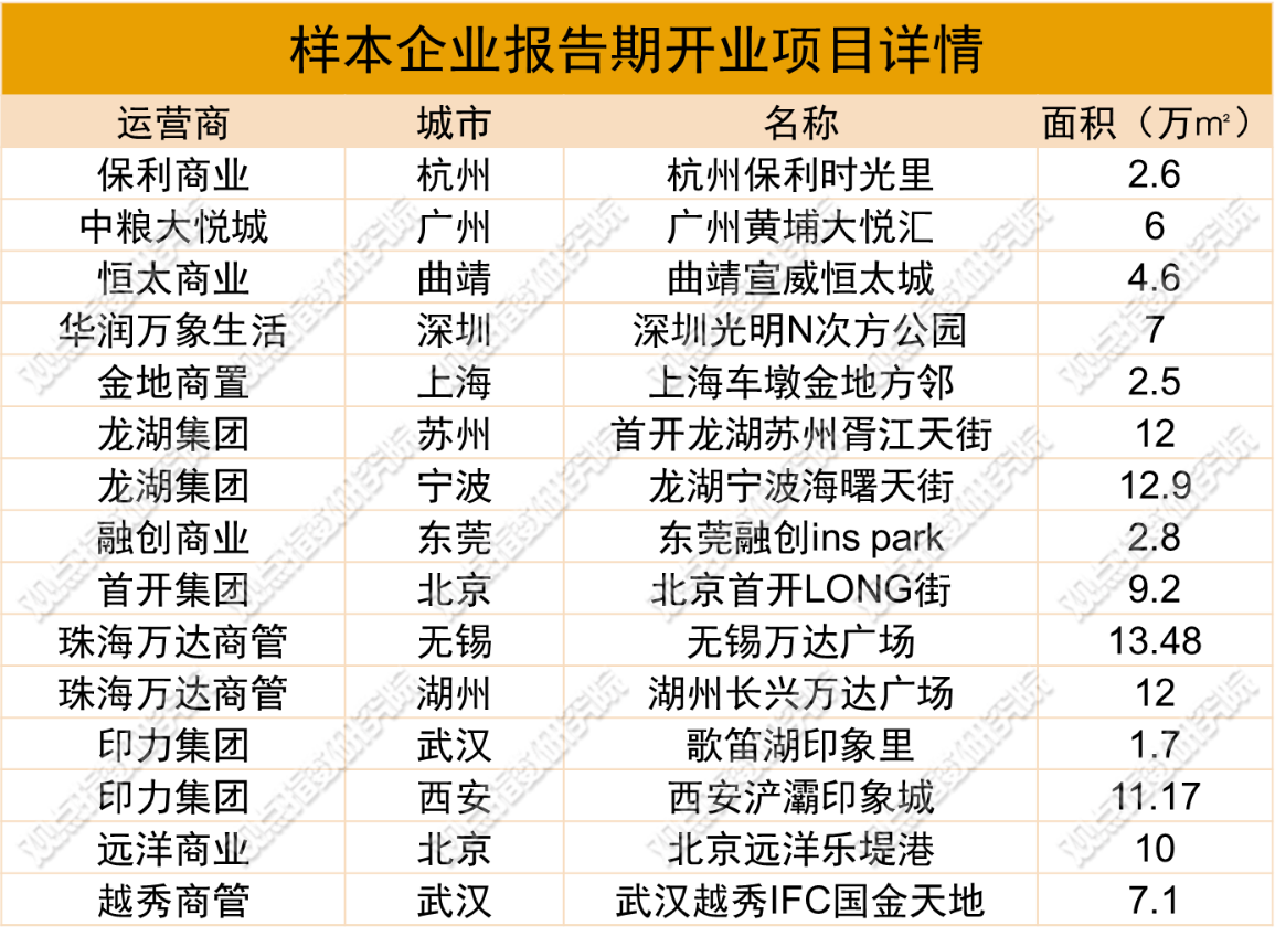 企業(yè)層面,大悅城、華潤萬象生活、龍湖集團(tuán)、印力集團(tuán)、珠海萬達(dá)商管等樣本企業(yè)期內(nèi)均有新項(xiàng)目開業(yè),占全國開業(yè)項(xiàng)目數(shù)量的比例接近5成。