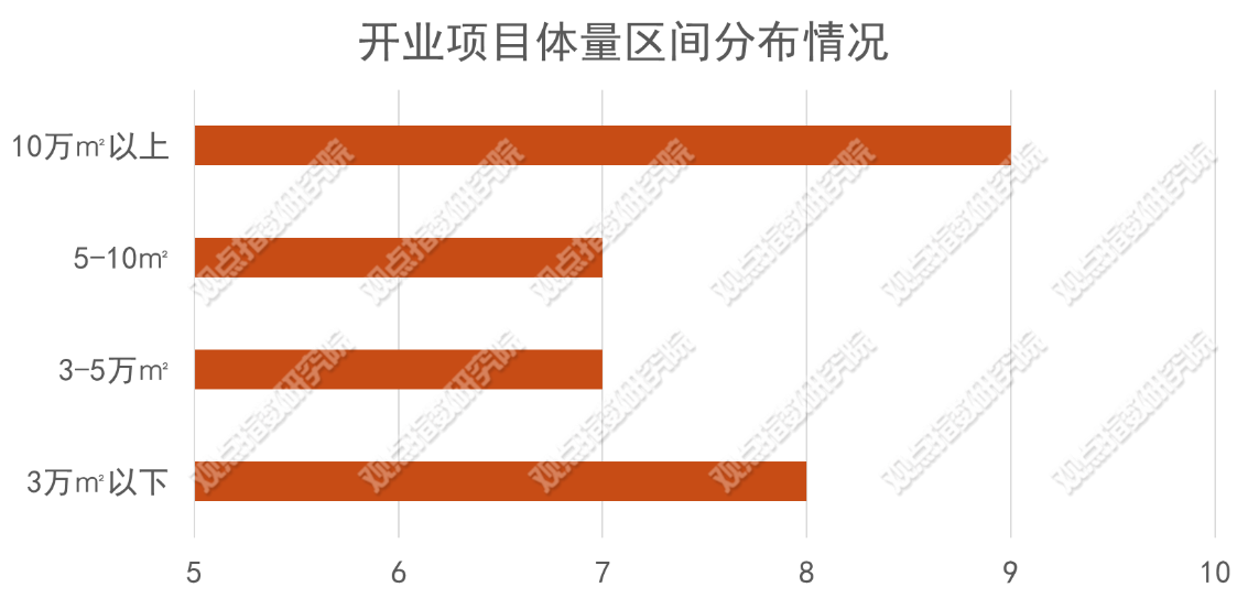 體量分布上面,期內(nèi)開業(yè)項(xiàng)目并無明顯的傾向,不同體量的項(xiàng)目數(shù)量相差不大,總體還是以10萬平方米以下的中小體量為主。