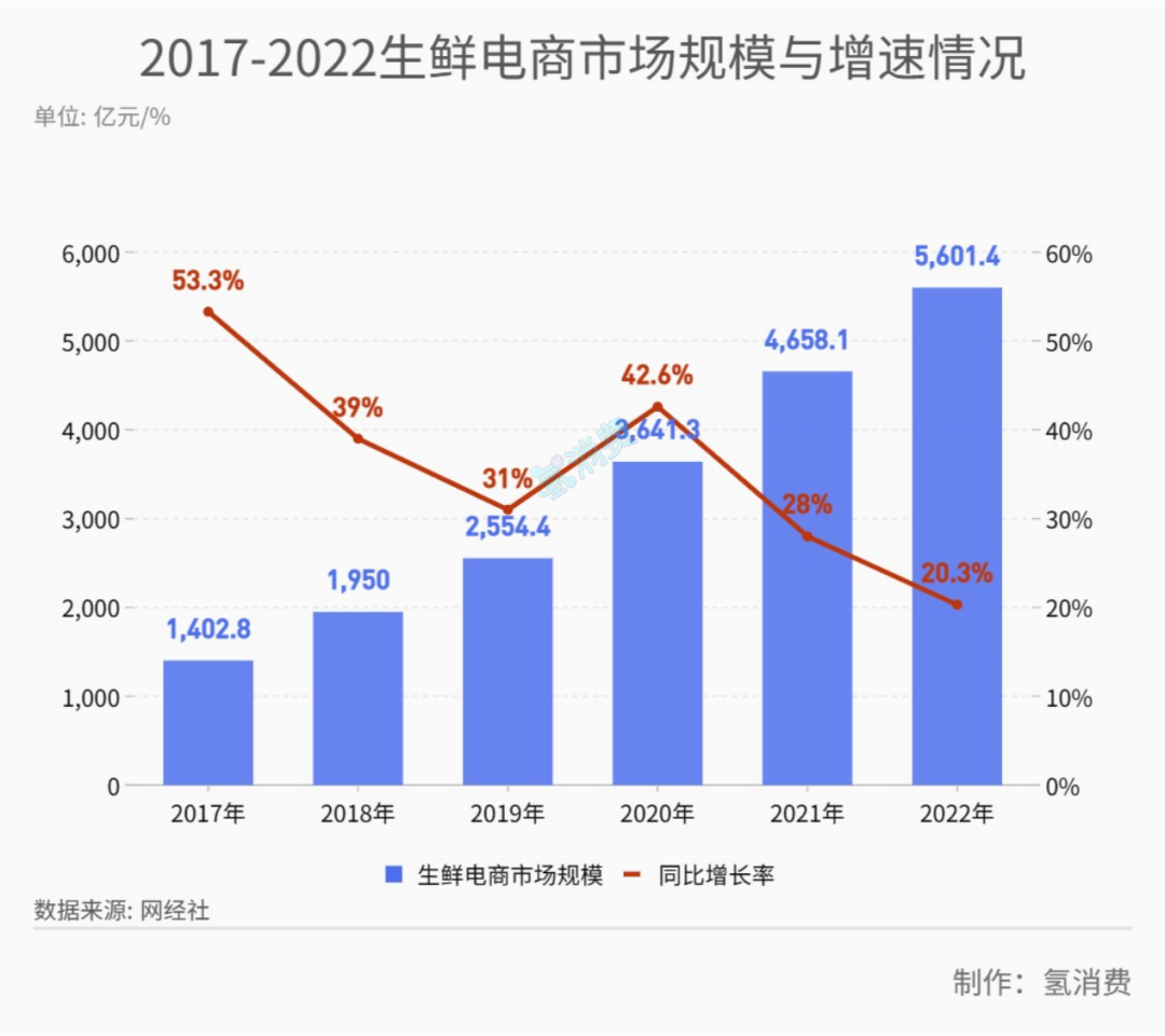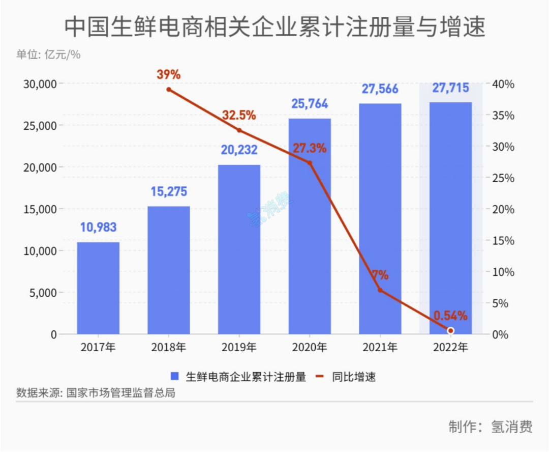 *近年來生鮮電商增速及相關(guān)企業(yè)注冊量等情況,制圖/氫消費(fèi)