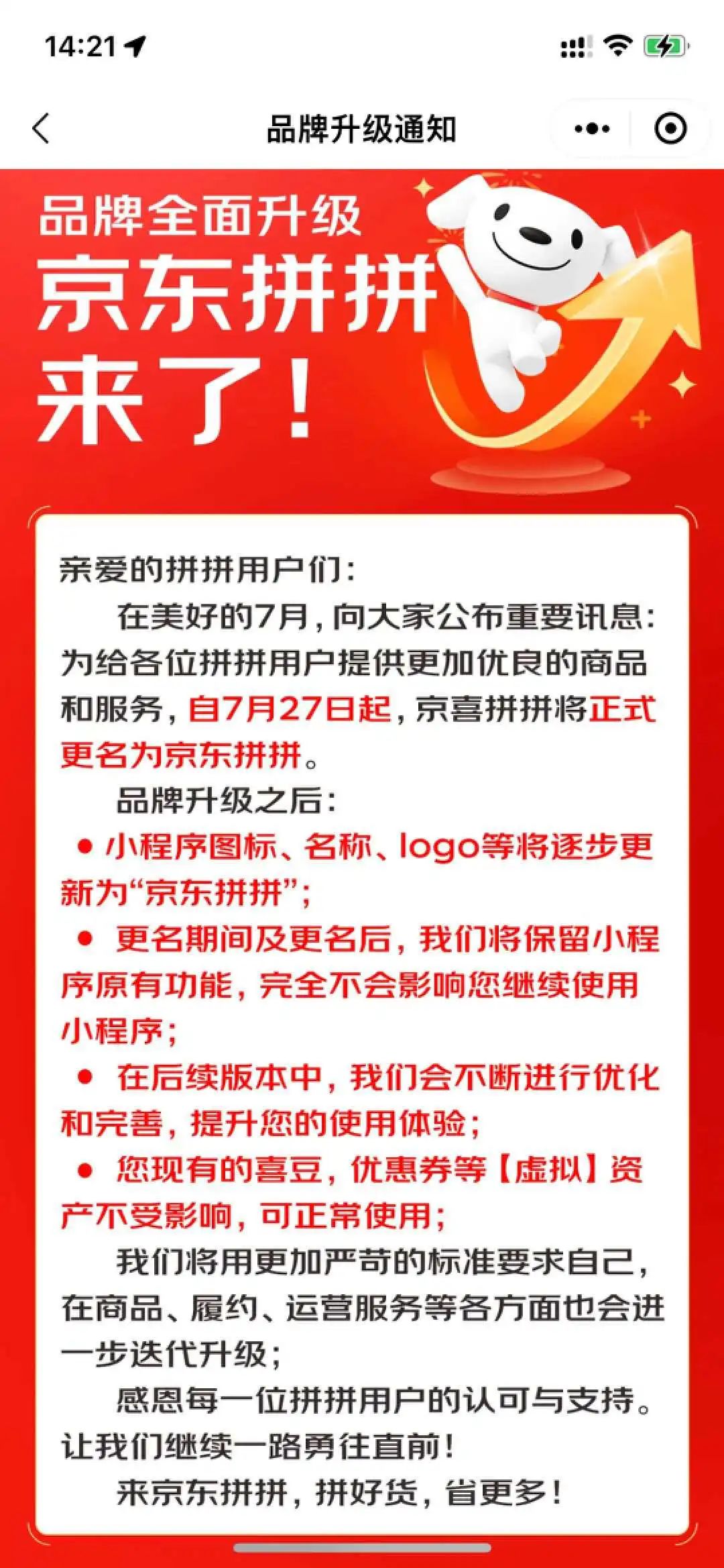 近日,京東社區(qū)團(tuán)購業(yè)務(wù)排頭兵“京喜拼拼”發(fā)布品牌升級公告。