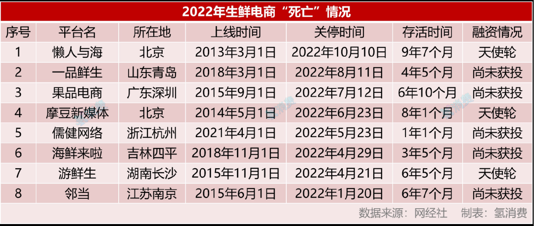 *2022年生鮮電商死亡名單,制圖/氫消費(fèi)