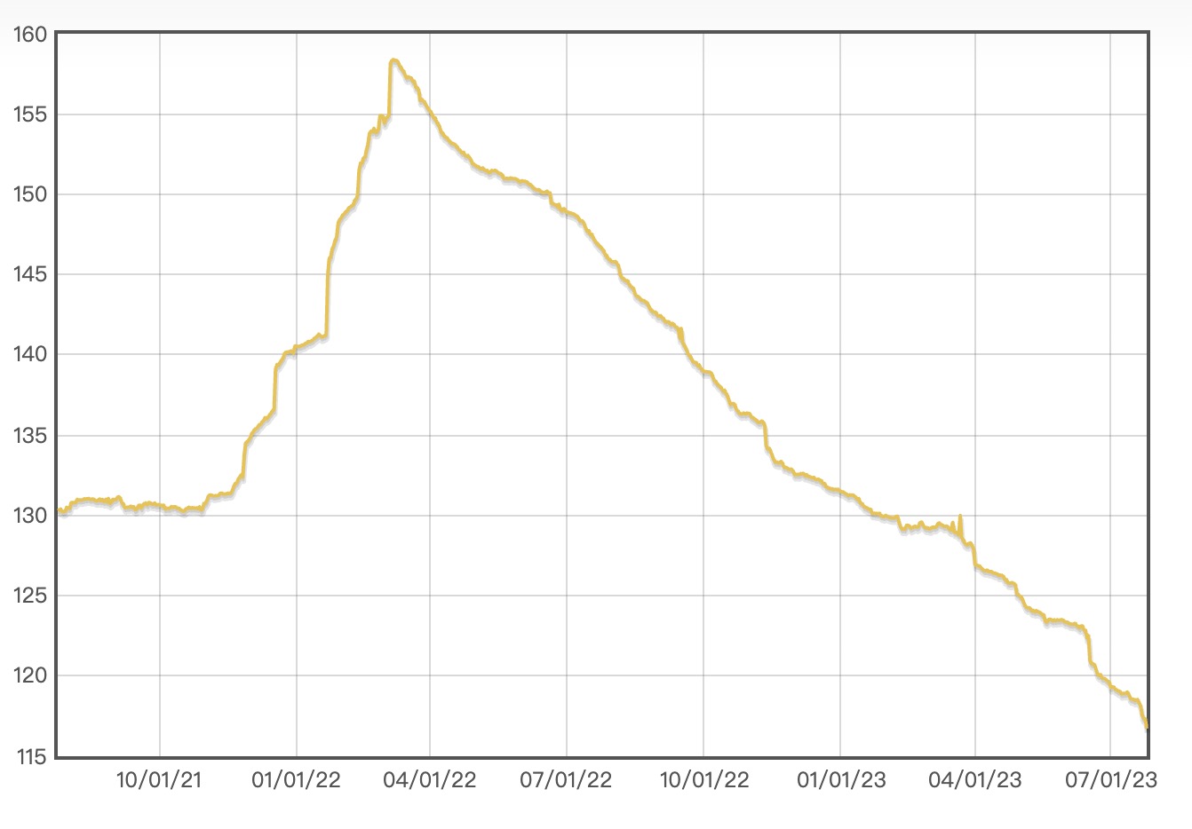 另外,上游毛坯鉆石的價(jià)格也大幅下滑。國際鉆石協(xié)會IDEX鉆石指數(shù)顯示,鉆石價(jià)格指數(shù)在2022年3月達(dá)到歷史高位158.16之后便持續(xù)下降。截至2023年7月25日,IDEX鉆石指數(shù)已跌去26%至116.72。獨(dú)立鉆石行業(yè)分析師Paul Zimnisky表示,一顆質(zhì)量略高于平均水平的1克拉天然鉆石售價(jià)已從6700美元降至5300美元。
