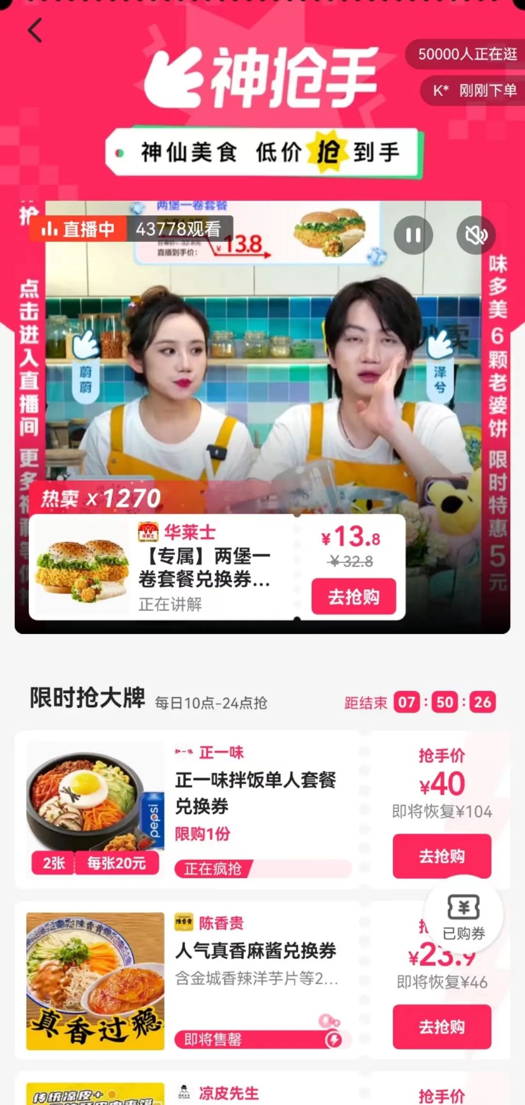 用戶加群后,會(huì)被官方企業(yè)微信引導(dǎo)至微信小程序,進(jìn)入美團(tuán)神搶手爆品會(huì)場(chǎng)(限時(shí)搶購(gòu)品牌商家爆品)和天天神券頻道(領(lǐng)取30元社群新人外賣紅包)。各地代理的直播間則會(huì)引導(dǎo)至美團(tuán)拼好飯和每日領(lǐng)取9元外賣紅包,拼好飯?zhí)柗Q“9.9元吃好,0配送費(fèi)”。