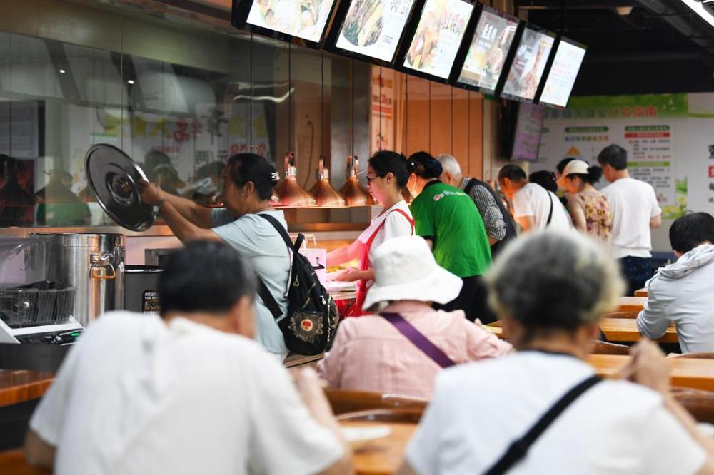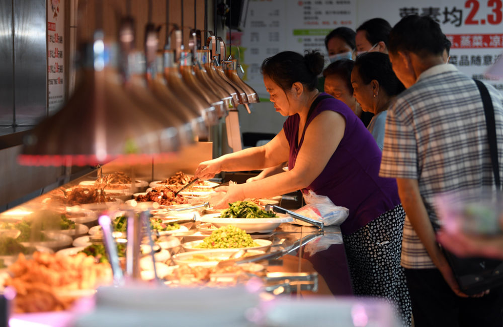 7月27日,居民正在貴陽市南明區(qū)合力超市南浦路店幸福大食堂用餐。