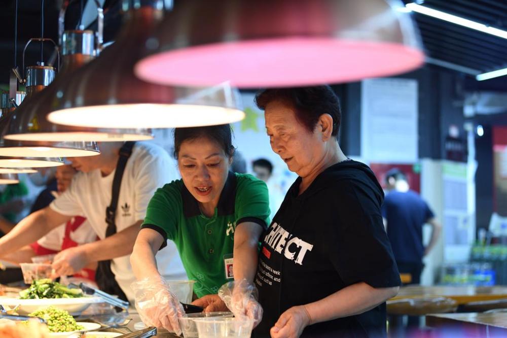 7月27日,貴陽市南明區(qū)合力超市南浦路店幸福大食堂的工作人員正在幫顧客取餐。