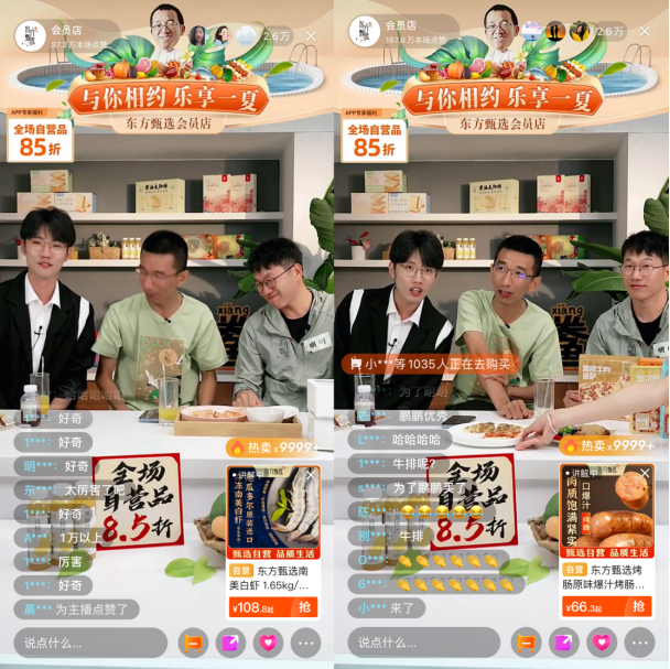 據(jù)東方甄選透露,7月26日晚,東方小孫、主播鵬鵬、明明在APP直播,為網(wǎng)友推薦講解自營產(chǎn)品,直播間同時(shí)在線人數(shù)超過2.6萬人,自營產(chǎn)品銷售破千萬元,烤腸、白蝦、雞胸肉、吐司、披薩、蟠桃、雞蛋等多款自營產(chǎn)品銷售均破1萬單。
