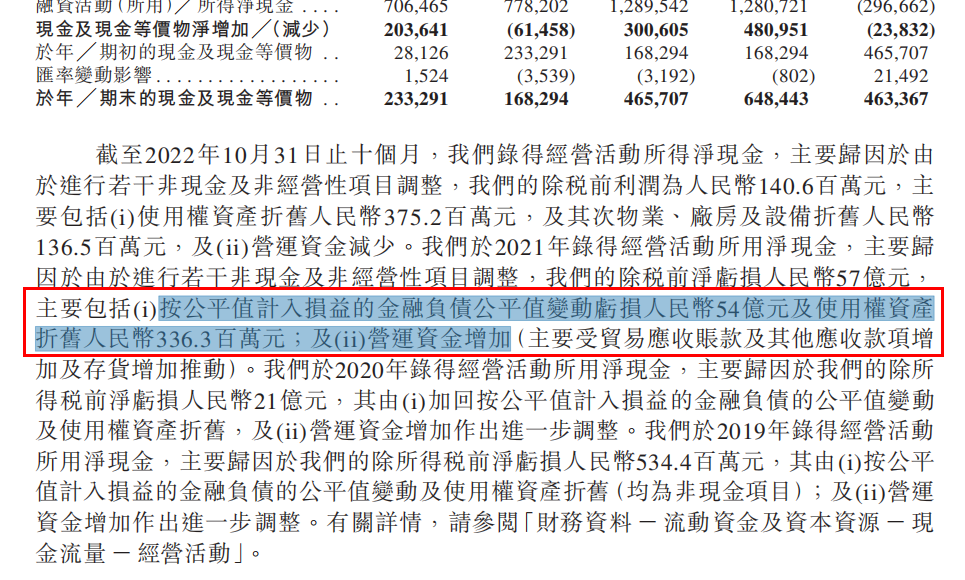 可以直觀地看到,負(fù)債總額與估值高度相關(guān),而虧損則與融資額變動(dòng)有關(guān),這告訴我們:估值越高融資越多,未上市前顯示的賬面負(fù)債及虧損越高。而2022年因KK集團(tuán)處于遞交招股書期間并無(wú)公開融資,因此估值因2022年疫情影響下的資本市場(chǎng)反而略有2%的微調(diào),于是2022年前十月顯示公司無(wú)虧損反而有盈利。不難看出這些都是因融資帶來(lái)的估值變化,是這一賬面虧損的主因。