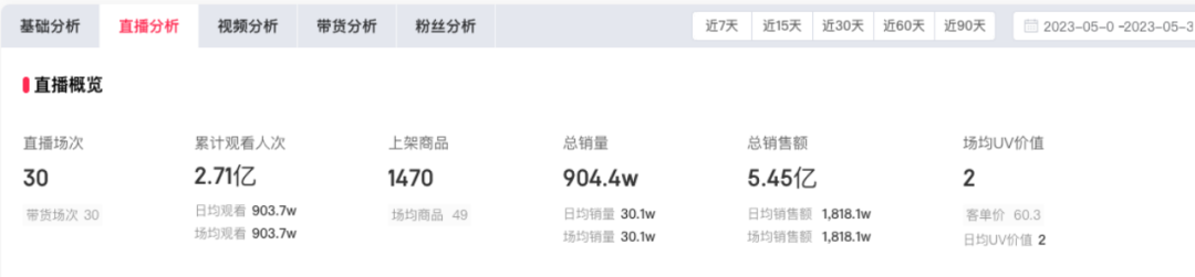 再看5月份數(shù)據(jù),東方甄選主號(hào)進(jìn)行了30場直播,總GMV為5.45億。