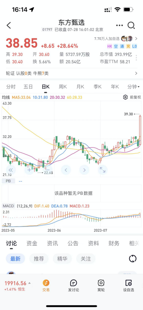 7月28日,東方甄選股價(jià)單日漲幅近30%。