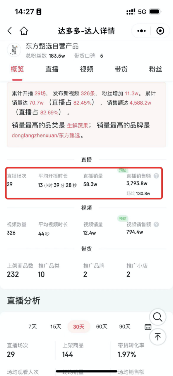 據(jù)達(dá)多多數(shù)據(jù)平臺(tái),東方甄選自營產(chǎn)品直播間在過去30天內(nèi),共直播29場,完成銷售額3793.8萬。