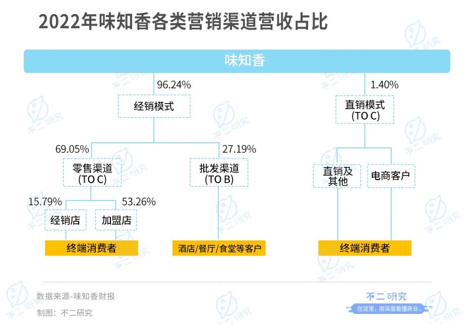 據(jù)味知香財報顯示,味知香2022年加盟渠道、經(jīng)銷店、批發(fā)渠道以及直銷渠道實現(xiàn)的營收占比分別為53.26%、15.79%、27.19%、1.40%,C端和B端的收入占比分別為69.05%、27.19%。