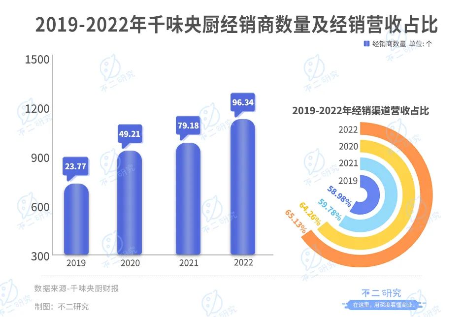 「不二研究」發(fā)現(xiàn),2022年,千味央廚經(jīng)銷渠道占比大幅上升。2019-2022年,千味央廚經(jīng)銷渠道營收占比分別為58.98%、64.26%、59.78%、65.13%。2022年經(jīng)銷渠道占營收比較2021年上升5.35%。