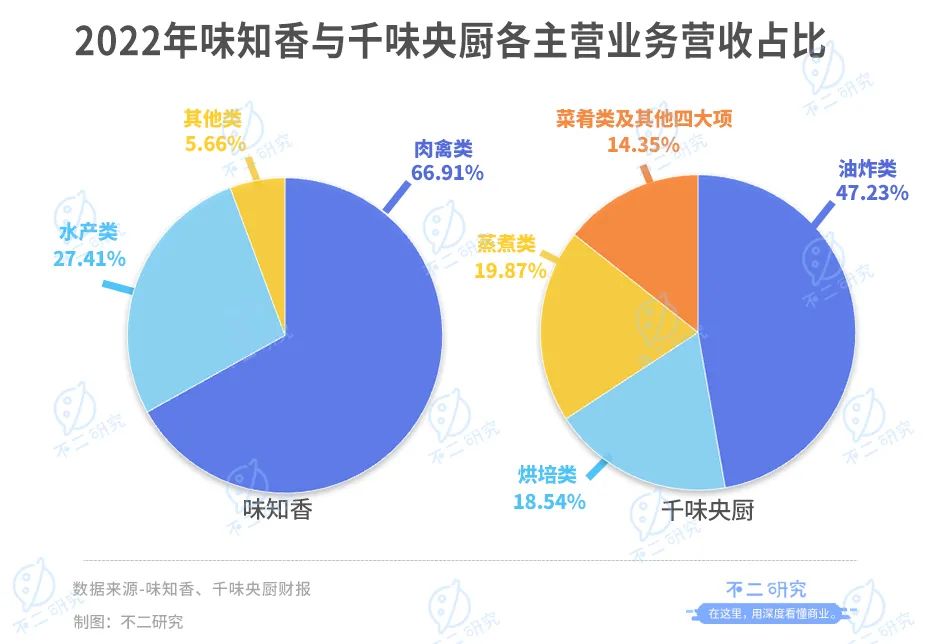 「不二研究」發(fā)現(xiàn),從業(yè)績看,味知香、千味央廚的凈利增速均在2022年放緩,且營收增速出現(xiàn)分化;從布局看,味知香以C端為主、B端為輔,而千味央廚專注B端;從產(chǎn)品看,味知香主攻肉禽水產(chǎn),千味央廚則專攻速凍米面制品。