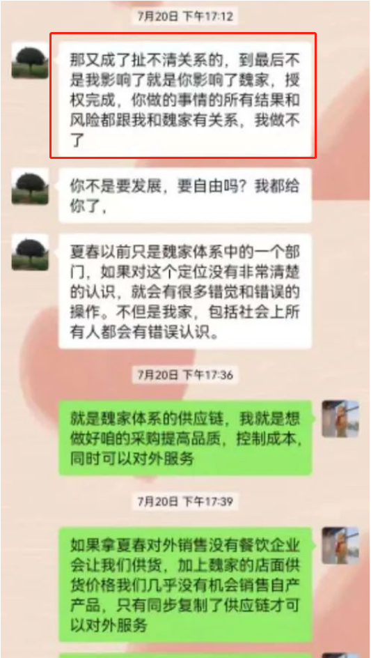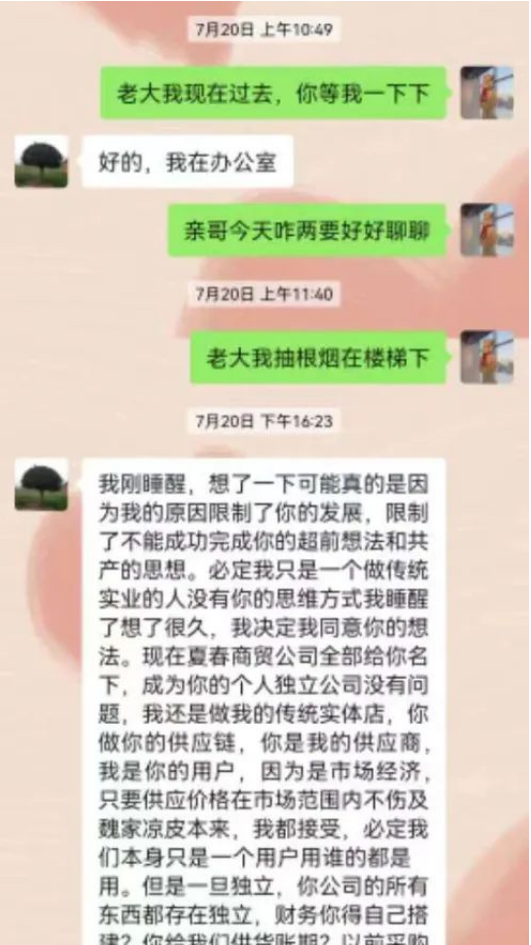 根據(jù)網(wǎng)傳魏、李二人的微信聊天記錄顯示,7月16日,為“解決采購(gòu)供應(yīng)商賬期不公道”的問(wèn)題,李春林提議拆解魏家涼皮供應(yīng)鏈重建新公司“做供應(yīng)鏈金融”,而該提議引發(fā)了二人后續(xù)的一系列分歧。