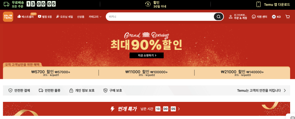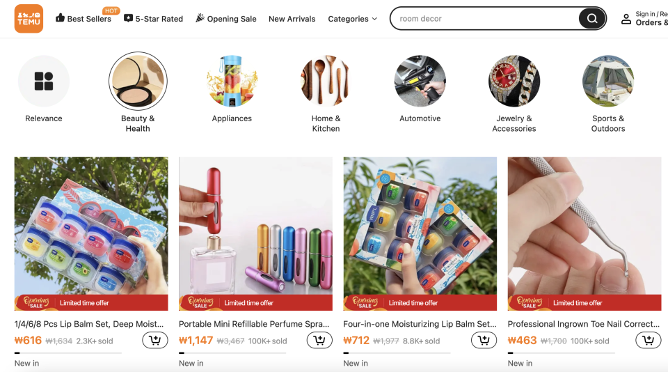 打開Temu剛剛上線的韓國站,首頁置頂跳動的字符直接告訴用戶——已經(jīng)“砍”掉了商品原價(jià)的90%。在這里,你可以用500韓元(約2.8元)左右的價(jià)格買一個針線包,也可以花不到2萬韓元(約110元)買一個空調(diào)扇。