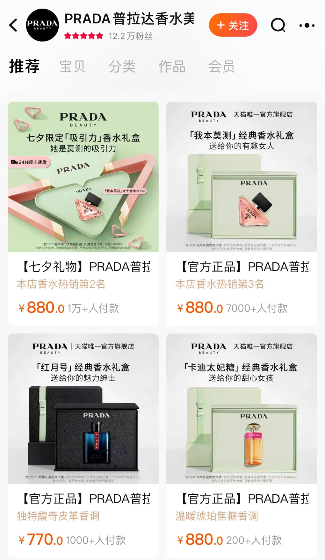 目前,Prada香水美妝天貓旗艦店粉絲為12.2萬人,其中售價在880元至1690元的我本莫測香水付款人數(shù)超1萬人。Prada香水美妝抖音旗艦店則擁有粉絲4.5萬人,總銷量近三千件。