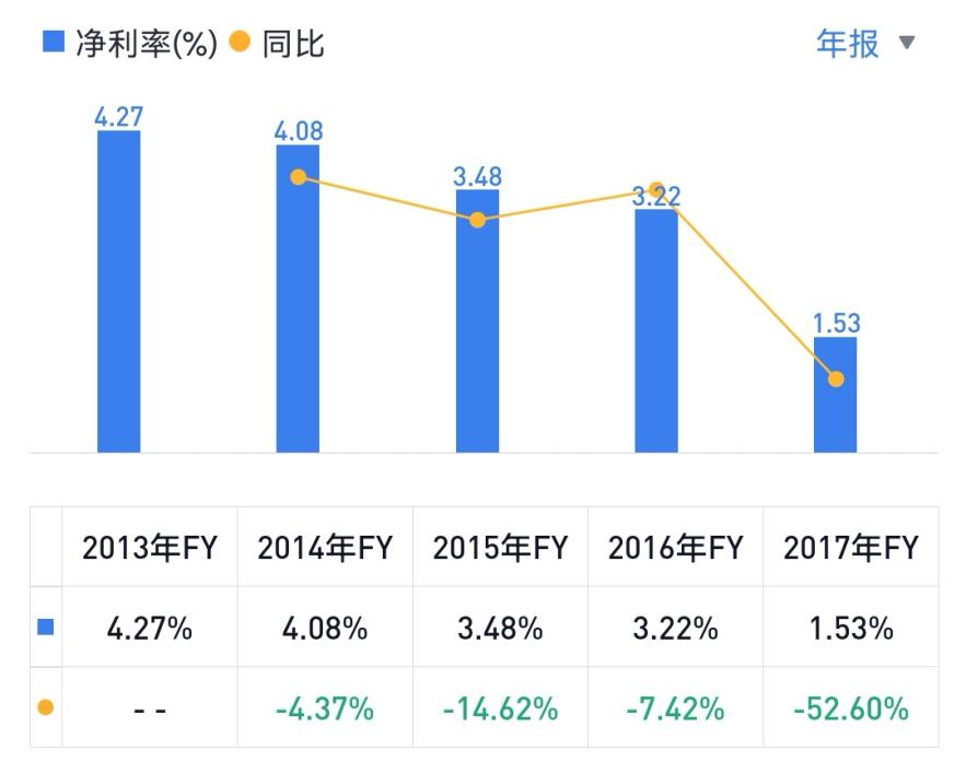 *毛利率常年保持在33%左右,凈利率在1.5-4.7%區(qū)間浮動。