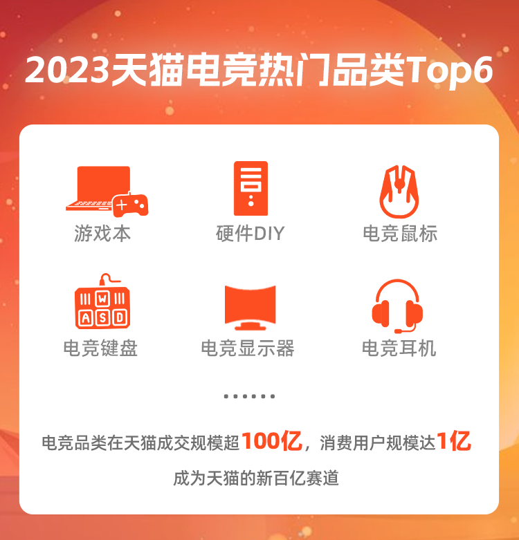 當(dāng)下,電競(jìng)儼然成為一種大眾狂歡,據(jù)統(tǒng)計(jì)中國(guó)電競(jìng)?cè)巳阂迅哌_(dá)4.8億+,主要集中在34歲以下年輕群體。來自天貓數(shù)據(jù)顯示,2022年電競(jìng)品類在天貓平臺(tái)成交規(guī)模已經(jīng)超過100億元,躍升為天貓的新百億賽道,消費(fèi)用戶規(guī)模已達(dá)1億。