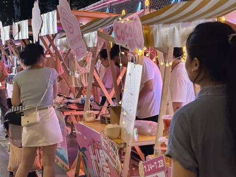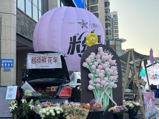 在巨型熱氣球腳下,便是“粉集”,一排排市集攤位和展開(kāi)著的后備箱,穿插于繁華霓虹燈之中,格外熱鬧。幸運(yùn)顧客還會(huì)遇見(jiàn)免費(fèi)送氣球的小丑,為粉集之夜增添樂(lè)趣;茨习税郯闉轭櫩途奶暨x市集品類(lèi),在這場(chǎng)市集中,顧客可以選購(gòu)包裝精美的花束送給身邊的人,可以品嘗一下買(mǎi)一贈(zèng)一的CoCo都可奶茶,可以為自己挑一件舒適的居家服,能看到大家耳熟能詳?shù)膭?dòng)漫周邊,還可以和開(kāi)著奔馳、賓利的攤位老板聊聊天。