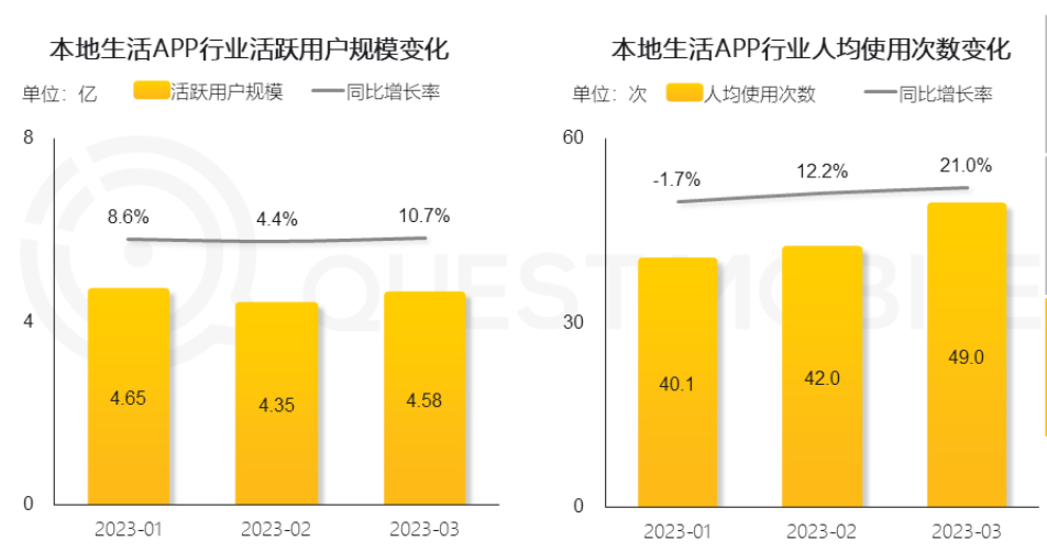 Quest Mobile數據顯示,2023年3月,本地生活行業(yè)迎來復蘇,在活躍用戶規(guī)模以及使用次數等方面較2022年同期均有明顯提升。移動互聯(lián)網細分行業(yè)活躍滲透率中,本地生活已經達到37.9%,僅次于地圖導航、支付結算和手機銀行。
