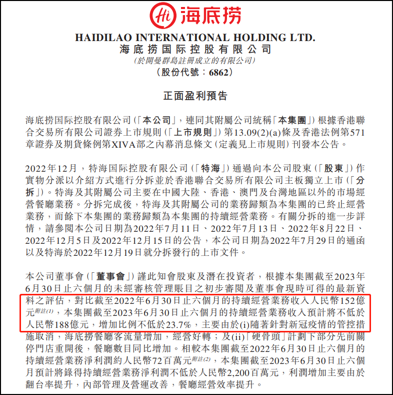 截至2023年6月30日,海底撈來(lái)自持續(xù)經(jīng)營(yíng)業(yè)務(wù)的收入預(yù)計(jì)不少于188億元人民幣,較上年同期增幅超過(guò)23.7%;持續(xù)經(jīng)營(yíng)業(yè)務(wù)凈利潤(rùn)預(yù)計(jì)超22億元人民幣。