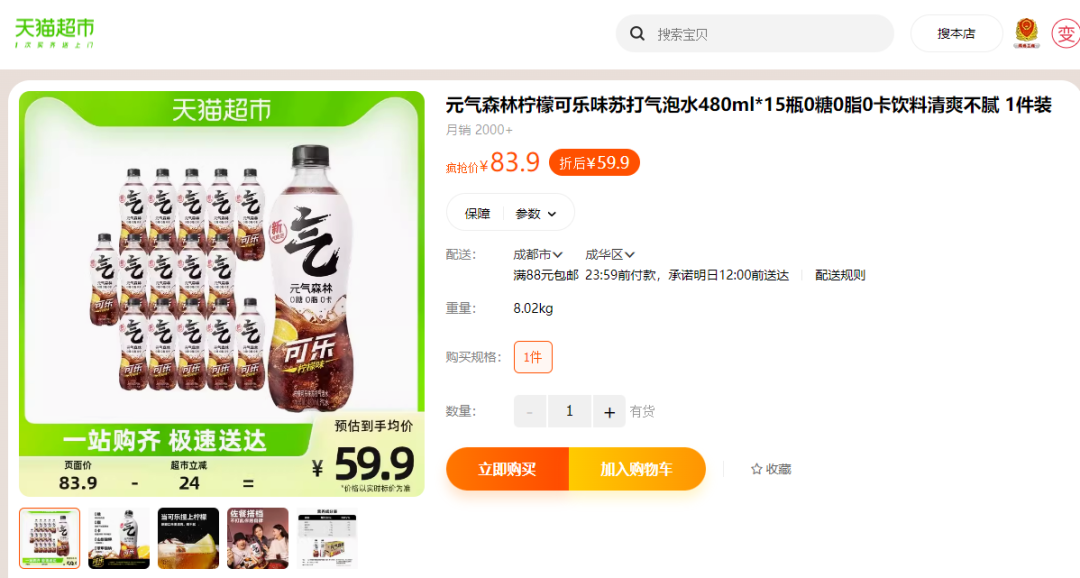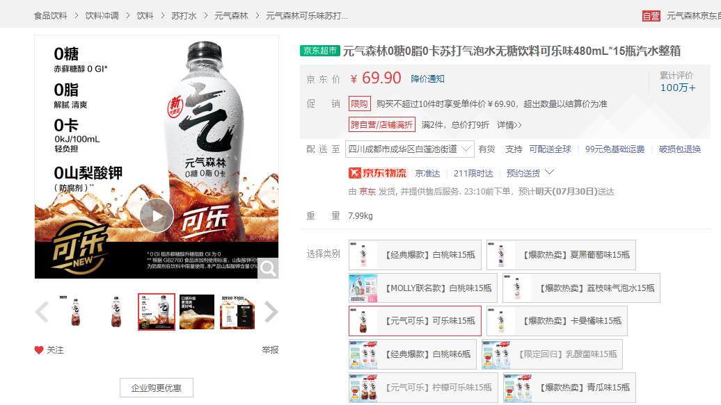 因?yàn),品飲匯7月29日在京東淘寶搜索發(fā)現(xiàn),元?dú)馍謿馀菟缃裨诰〇|的售價(jià)為15瓶69.9元,折算下來約4.5元1瓶,在天貓有活動(dòng)的情況下,元?dú)馍謿馀菟氖蹆r(jià)為15瓶59.9元,約4元1瓶,這與可口可樂現(xiàn)在的售價(jià)相差已經(jīng)小于1塊。