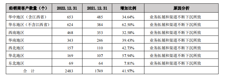 鹽津鋪?zhàn)釉谏坛睜I渠道的營收占比從2017年的超半成跌至2022年的12.85%。反之,經(jīng)銷商渠道在幾年時(shí)間內(nèi)迅速崛起,2022年貢獻(xiàn)了超7成的營收業(yè)績。