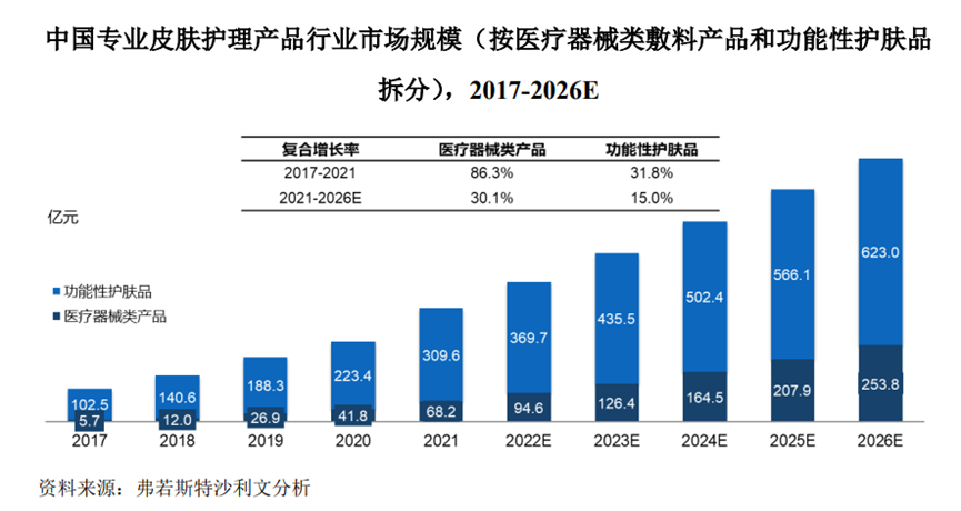 2015年左右,功能性護膚品才在國內(nèi)真正崛起。自2017年起,中國功能性護膚的市場增速始終高于護膚品整體市場增速,誕生了一個個廣為人知的超級IPO。