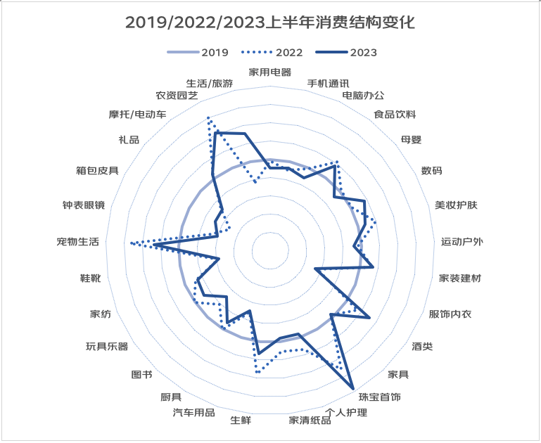 相較于2019年,從品類來看,單價更高的電類消費、鐘表眼鏡、汽車用品等消費金額雖然逐年增長,但消費占比在四年中呈現(xiàn)下降趨勢,同時出現(xiàn)類似情況的還有服飾鞋靴、玩具圖書等。與此同時,占據(jù)消費越來越大比例的則有家裝、廚具、食品、生鮮、園藝、寵物、生活/旅游等。