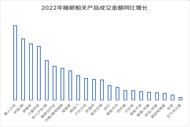 再比如,人們?yōu)樽屪约核酶卜(wěn)也是“無所不用其極“。智能床墊、懶人沙發(fā)、吊籃/吊椅、頸椎枕、睡眠治療儀、躺椅/折疊床就是需求增長最快的品類,其中沙發(fā)、椅類主要滿足的是午休/碎片化睡眠的需求,而頸椎枕、睡眠治療儀則反映出人們追求睡眠質(zhì)量的要求增長。