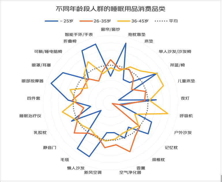 而36-45歲消費者則更關(guān)注兒童床墊、呼吸機、睡眠治療儀以及折疊椅、吊籃/椅等,反映出這個年齡段人群除了自己的睡眠需求,還需要照顧老人和孩子的健康和生活質(zhì)量。