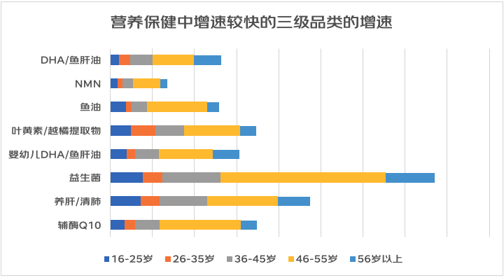 營養(yǎng)保健消費的結(jié)構(gòu)(占比)增長180.61%,四年成交金額增長379%,其中46-55歲人群消費增速較高。在三級品類中, 益生菌的增速較高, 46-55歲人群四年成交金額增長達78倍。