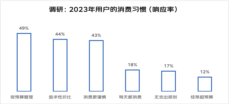 消費理性的另一個突出表現(xiàn)是預算控制,理性解讀自身的需求。根據(jù)調(diào)研結(jié)果,按照預算管理消費、買性價比最高的商品、消費更謹慎排名今年用戶消費習慣前三名。分別有49%、44%、43%的受訪者在決策前會“根據(jù)預算理性分析需求”、“追求商品的性價比”或“更謹慎”。