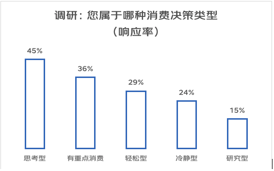 從消費決策類型來看,理性分析需求和商品的性價比的“思考型消費”占比第一,達到45%;有側(cè)重點的消費(喜歡的東西要買高品質(zhì)的,其他東西能省則。┡琶诙,都比較符合普遍共識,“喜歡就買”的輕松型消費排名第三,但用戶傾向的是“不貴就試試看”,占比29%。