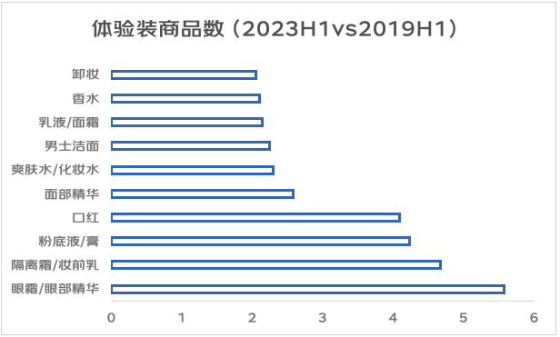 從供應端來說,近5年,護膚品體驗裝商品數(shù)增長超過2倍。2023上半年,眼霜/眼部精華、隔離霜/妝前乳、粉底液/膏、口紅品類的體驗裝數(shù)量超過2019年同期的4倍以上。