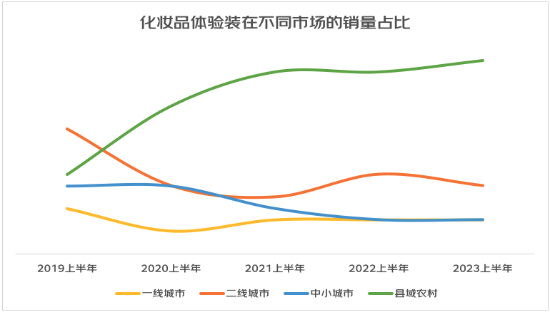 近5年,縣域農(nóng)村地區(qū)購買化妝品體驗裝的銷量占比明顯上升,從2019年上半年的17%,上升到2023年上半年的29%,近3成的護膚美妝體驗裝賣到了縣域農(nóng)村。