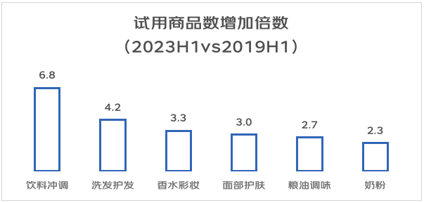 除了美妝品類,2023年上半年,線上銷售體驗裝的商品數(shù)量超過了2019年同期的2.1倍。其他品類如飲料、洗發(fā)護發(fā)、糧油調(diào)味、奶粉、嬰兒紙尿褲等都推出了體驗裝。飲料品類將多種不同口味的飲料包裝到一起,讓消費者一次消費可以嘗到多種口味,然后根據(jù)自己的喜好再復購;洗發(fā)、奶粉品類則推出小劑量的體驗裝,讓用戶可以在試用體驗的基礎(chǔ)上復購正裝產(chǎn)品,減少過敏等不適帶來的損失。