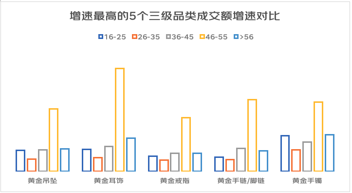 從結(jié)構(gòu)變化來看,成交額增速較高的品類偏好也在發(fā)生變化。傳統(tǒng)的戒指、手/腳鏈的金額占比所有下降,但手鐲、投資金的占比有明顯上升。