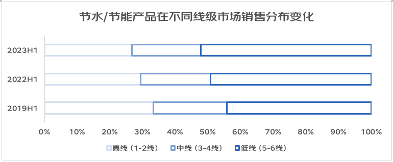 但是從線級滲透率來看,目前節(jié)能電器產(chǎn)品的主要消費力量來自1-2線城市,二線城市甚至高于一線城市;而低線市場雖然需求強勁,但依然有較大增長空間。