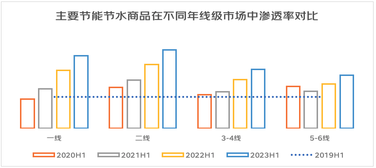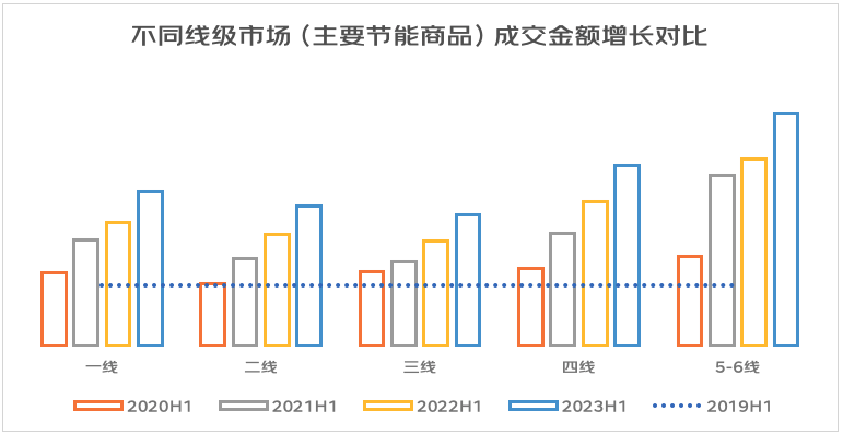 與大城市情況不同的是,我國中低線市場的耐用品消費進入到更新周期——從2009年家電下鄉(xiāng)至今已十余年,2023年,環(huán)保、節(jié)能減排和綠色是下沉市場消費升級的重要標志,下表可見四年來節(jié)能商品成交金額整體增長(以2019年1-6月為基期):