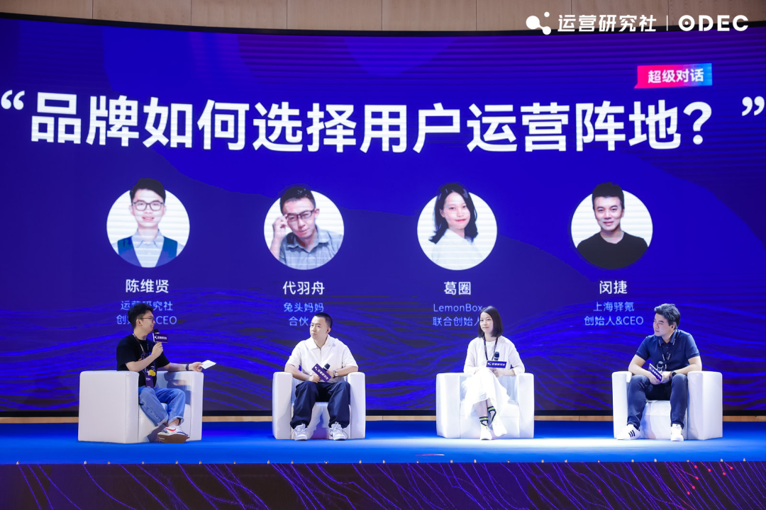現(xiàn)在大多數(shù)品牌都在布局全域經(jīng)營,會在不同的渠道陣地做私域。這場圓桌,由運營研究社創(chuàng)始人陳維賢做主持,兔頭媽媽合伙人代羽舟、LemonBox 聯(lián)合創(chuàng)始人葛圈以及上海驛氪創(chuàng)始人 & CEO 閔捷,一起探討《品牌用戶如何選擇用戶運營陣地》。