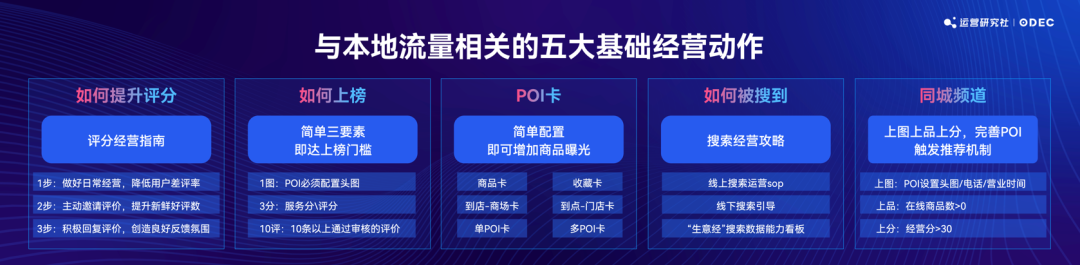 王丁虓分享了一套打法,把本地流量相關(guān)的經(jīng)營動作分為五類:如何提升評分、如何上榜、POI 卡、如何被搜到、同城頻道(具體細節(jié)可放大圖片查看)。