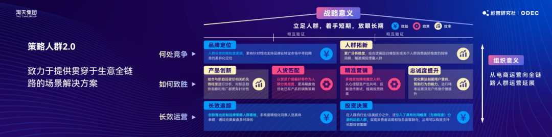 其中人貨匹配、精準營銷是提升品牌短期效率的,而產(chǎn)品創(chuàng)新、人群拓新以及忠誠度提升,是用來激發(fā)品牌潛能,提升品牌中期效果的部分。而長效追蹤、品牌定位,以及投資決策,是著眼于構(gòu)筑未來的品牌“護城河”。